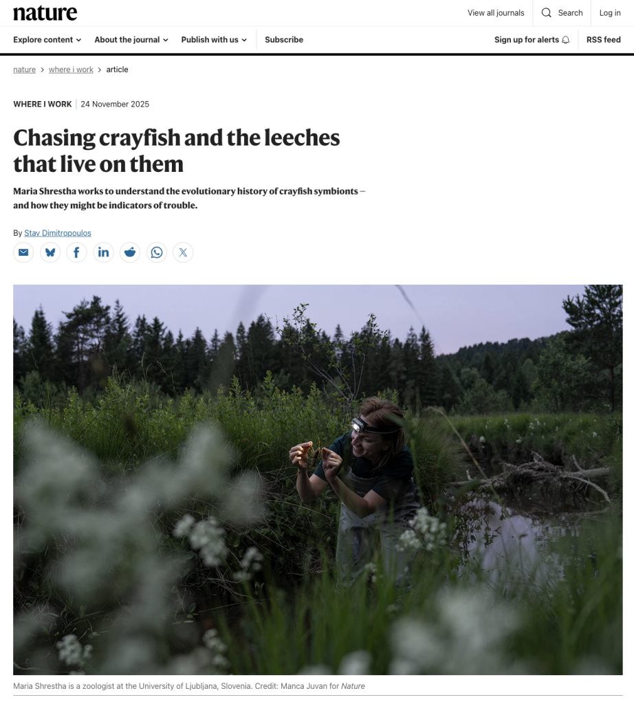 Zelo zabavno je bilo opazovati zoologinjo Mario Shrestho med njenim raziskovalnim delom v reki Beloščici v Sloveniji. Za več informacij obiščite to povezavo: https://doi.org/10.1038/d41586-025-03861-4